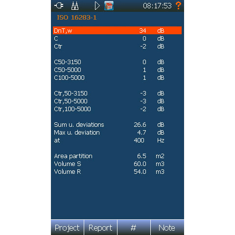 The Nor150 sound analyser offers a built-in signal generator for excitation of the source room level measurements or for excitation of the reverberation time measurements. The results are measured in accordance with the ISO 16283 Standard requirements. With additional background level measurement results, an on-board calculation of the final airborne sound insulation indices DnT and Rw in accordance with ISO 717 is performed. Of course, the similar possibility is available for impact sound insulation index Ln,w using a tapping machine such as the Nor277.